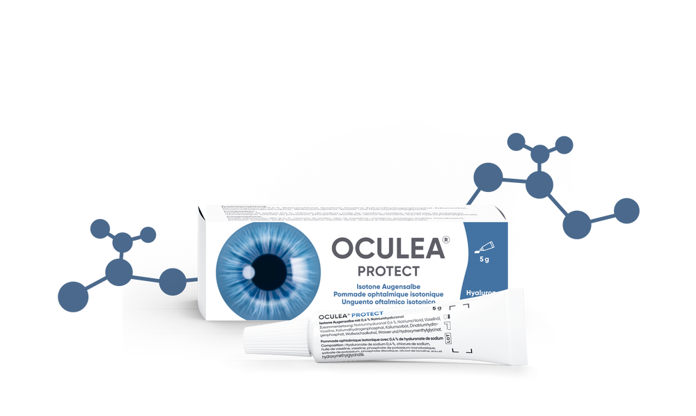OCULEA® PROTECT contribue à maintenir l’hydratation des yeux et aide à former un film protecteur à la surface de l'œil. Il réduit l'évaporation du film lacrymal chez les patients souffrant de lagophtalmie nocturne (yeux qui restent partiellement ouverts des pendant le sommeil) et atténue les symptômes liés.