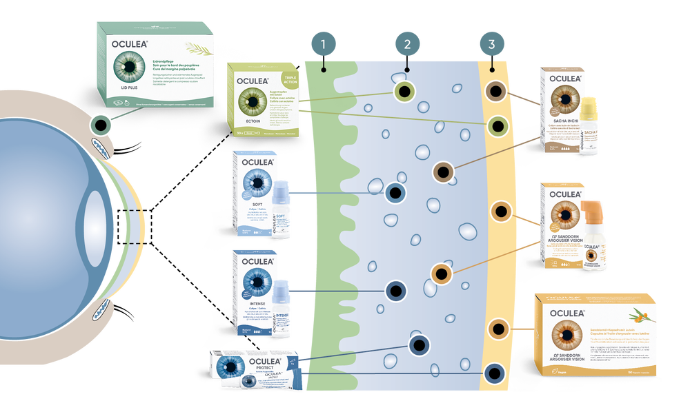 La gamme OCULEA® propose un produit adapté à chaque degré de sévérité de la sécheresse oculaire. Les produits sont composés d'acide hyaluronique à longue chaîne de la plus haute qualité et sont, pour certains, combinés avec des ingrédients naturels comme l'huile de Sacha Inchi ou d'argousier. Le concept thérapeutique couvre l'application de l'extérieur comme de l'intérieur.